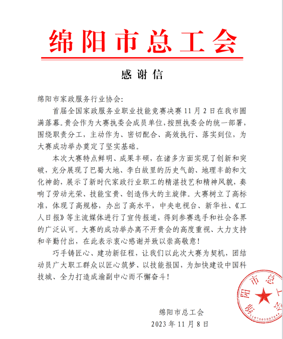 綿陽市家政服務(wù)行業(yè)協(xié)會力助首屆全國家政服務(wù)業(yè)技能競賽決賽在綿陽圓滿落幕,綿陽市總工會高度贊揚,綿陽市美新家政熱烈祝賀!
